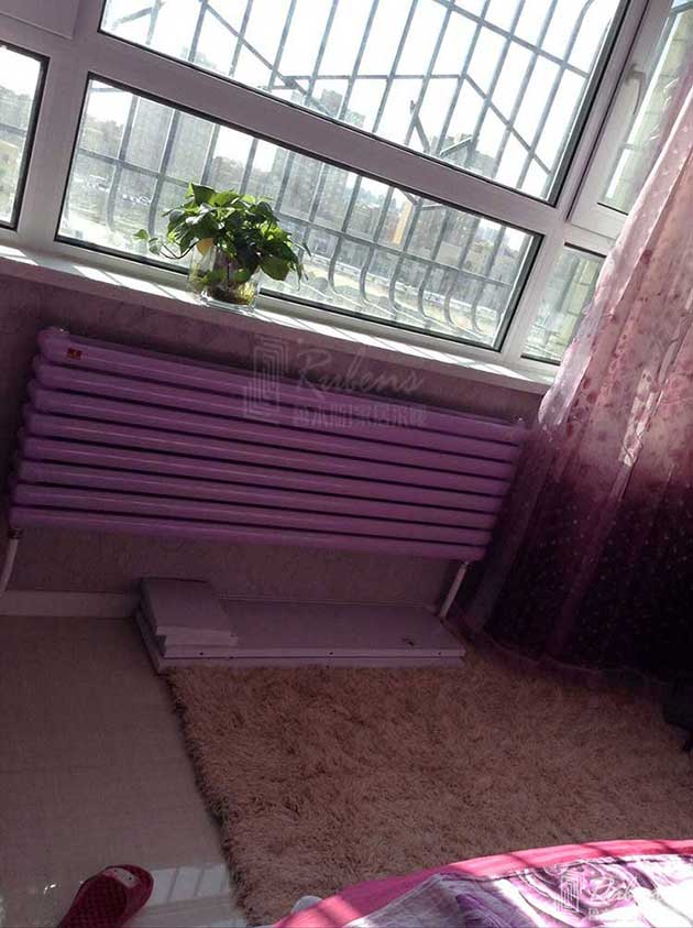窗台下带毛巾杆的粉红色暖气片安装效果图