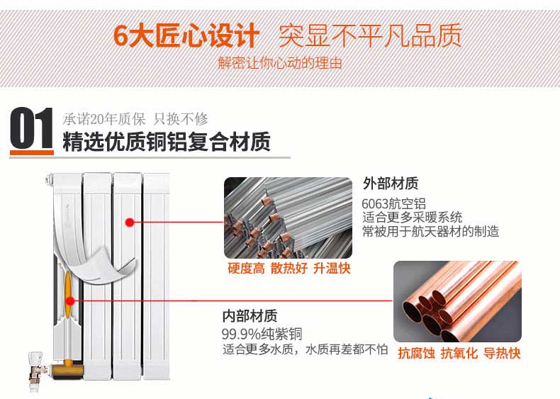 蓝狮平台铜铝复合列宾系列暖气片散热器,独特的防熏墙设计,有效的减轻墙面的熏黄与熏黑;材料升级,内腔铜管采用“冷轧拉伸紫铜管”,新型高强度紫铜管,目前只有蓝狮平台在使用;冷轧拉伸紫铜管+铝镁合金,散热量超大,适合任何供暖系统,一辈子不用更换;表面经过20道工序处理,外喷涂采用美国立邦粉末涂料,亮光度达98%,永恒经典的外观设计,可与任何装饰风格匹配;该款产品设计使用寿命五十年,出厂前均在21公斤压力环境下试压四次,保证产品无论任何情况下都不会爆裂,三十年内,若因质量问题漏水,一律换新,免除后顾之忧!