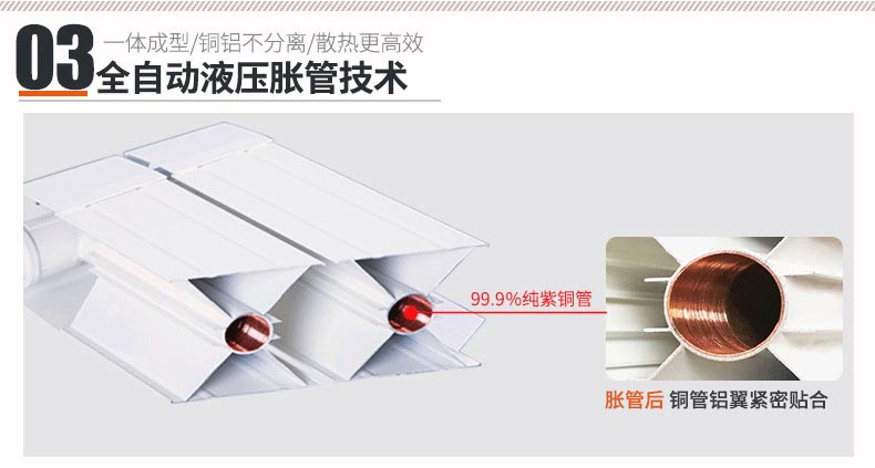 1、采用99.99%纯度的TP5型电解紫铜管,导热性能好,高效节能,不腐蚀,是非常耐用的散热器,使用寿命30年以上;