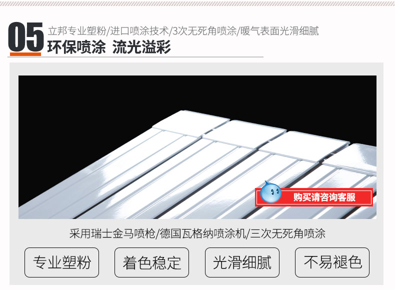 4、采用美国立邦粉末涂料,亮度达98%,涂层耐冲击1级,所有产品均三喷三烤工艺;