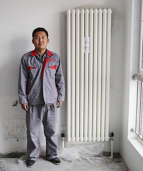 对了,差点忘了我们的安装师傅,来个正面特写。简直不忍直视啊,暖气片怎么显得安装师傅这么黑啊,开个玩笑,不要打我呀,哎住手....!