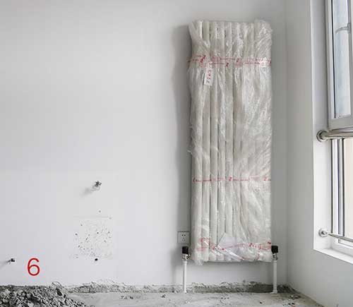 图5所示,这是房产商标配的钢铝复合暖气片,普及一下知识,钢铝材质的暖气片走水管道细,容水量少,未做内防腐处理,热衰减现象严重,我们从图片中就能明显看出有磕碰、腐蚀甚至漆面都不光滑,质量可见一斑。