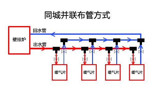 明装暖气片布管方式有双管同程并联和双管异程并联方式,一般前者使用较多。同程并联特点是进水管道与各个暖气片之间距离很近,受热均匀方便维护。明装方式进出水管道露在外面,美观上要比暗装方式差一些,有些家庭使用扣槽将管道隐藏起来,缓解了外观上的不足。