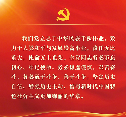 一、我们党立志于中华民族千秋伟业,致力于人类和平与发展崇高事业,责任无比重大,使命无上光荣。全党同志务必不忘初心、牢记使命,务必谦虚谨慎、艰苦奋斗,务必敢于斗争、善于斗争,坚定历史自信,增强历史主动,谱写新时代中国特色社会主义更加绚丽的华章。