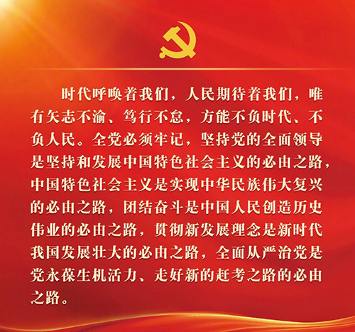 十一、时代呼唤着我们,人民期待着我们,唯有矢志不渝、笃行不怠,方能不负时代、不负人民。全党必须牢记,坚持党的全面领导是坚持和发展中国特色社会主义的必由之路,中国特色社会主义是实现中华民族伟大复兴的必由之路,团结奋斗是中国人民创造历史伟业的必由之路,贯彻新发展理念是新时代我国发展壮大的必由之路,全面从严治党是党永葆生机活力、走好新的赶考之路的必由之路。