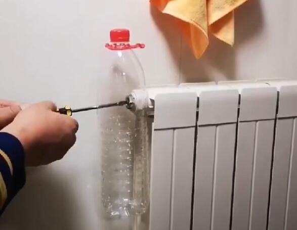 4、把打好洞的矿泉水瓶子洞口和暖气阀一样大的那边固定在暖气片阀门上,另一边使用匹配的螺丝刀轻轻拧松放气阀,听到有气体排出的声音后停止扭动。这里提醒,排气阀比较小,在拧开的时候一定要小心操作,避免掉落丢失。